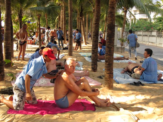 The massage guys and the mani-pedi ladies circulate among the chairs along with folks selling fruit, various foods, watches, cheap jewelry, pirated DVDs and pornography. They easy accept a simple "mai krap" (no thanks) and move on. Not really a bother. The massage guys and mani-pedi lady remiembered me from past years. It's like a pleasant reunion.